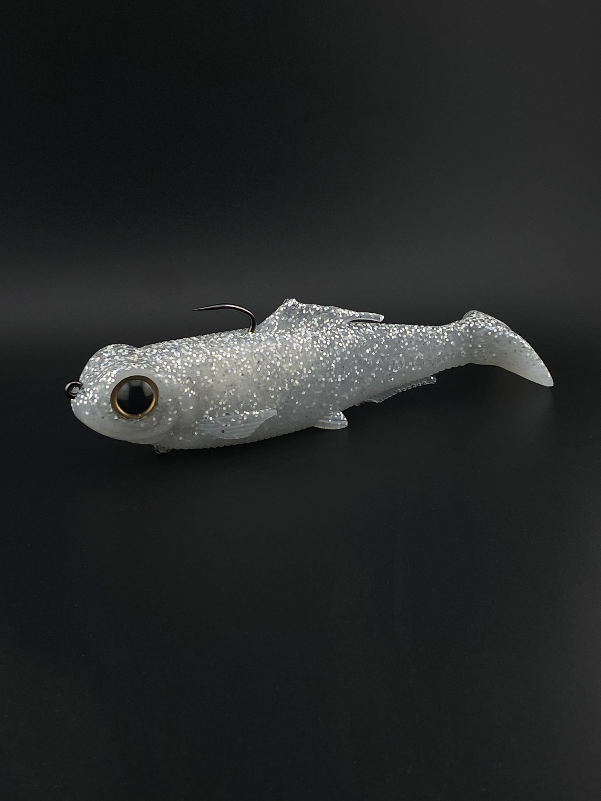 Solid internal harness with a stout jighook. Far casting and wide kicking action. Hard safety eyes epoxied into the harness for durability. Hand poured with platinum silicone for maximum quality. Designed and built in Massachusetts.